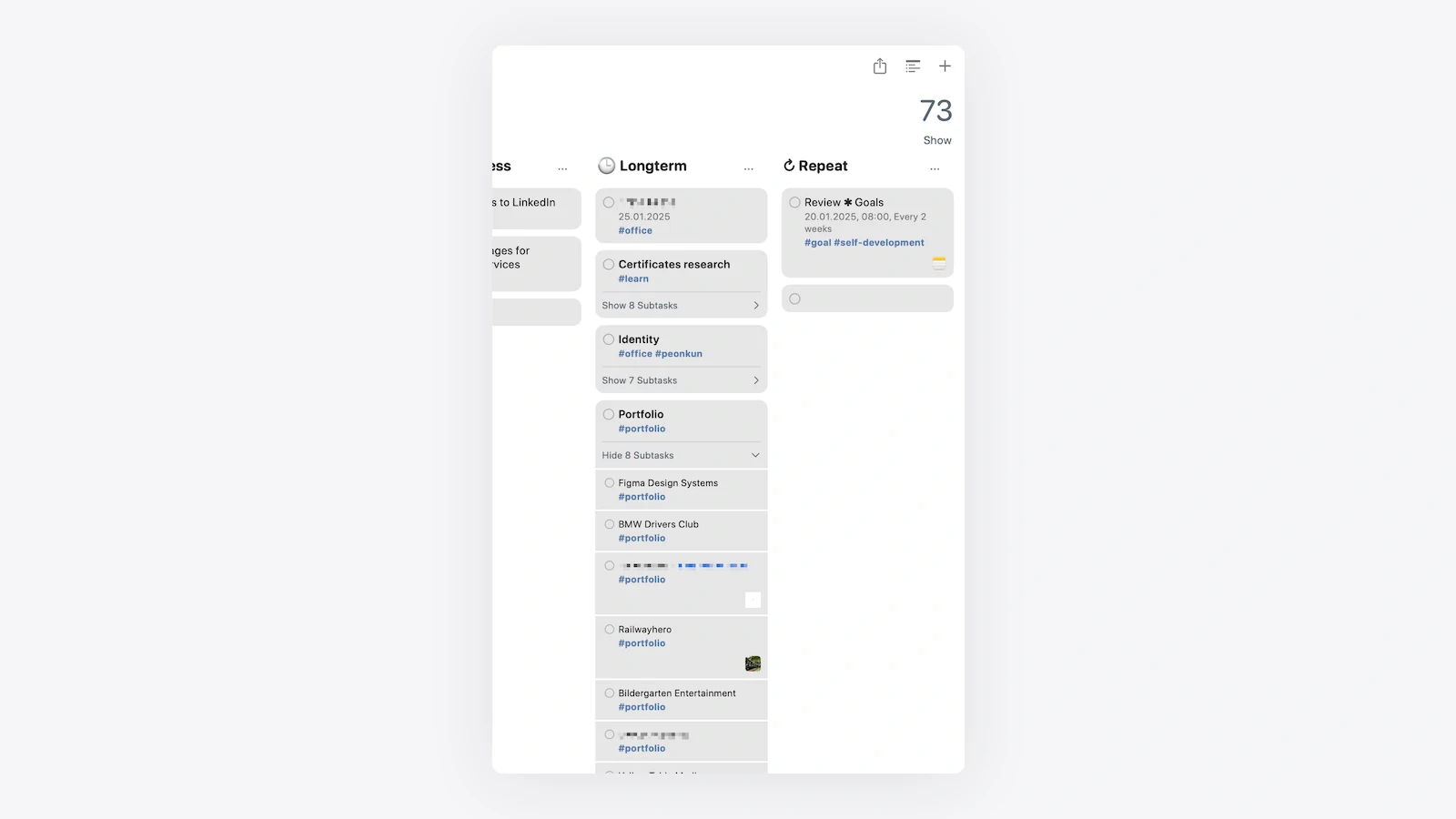 - Longterm: Future goals or low-priority tasks.